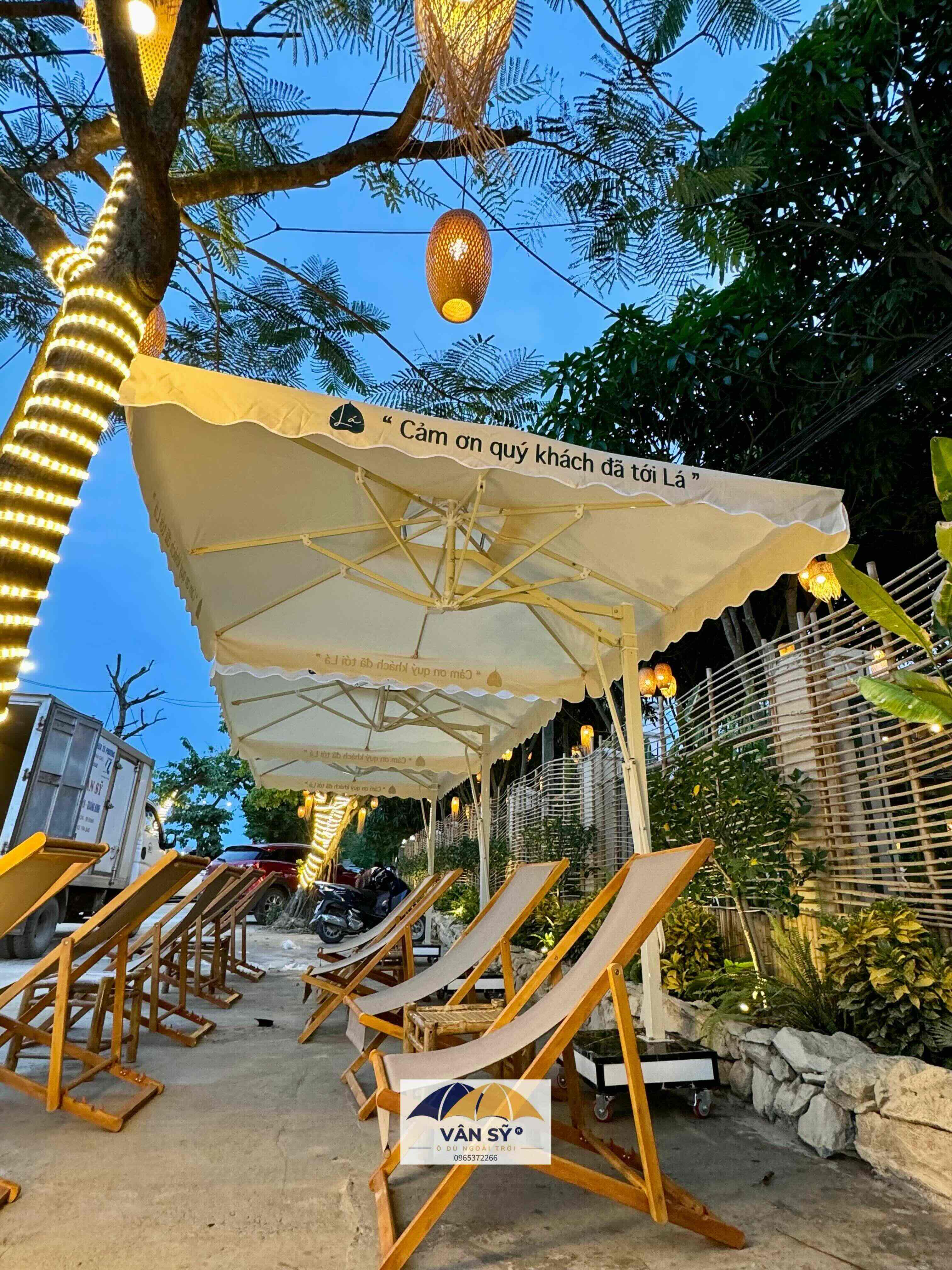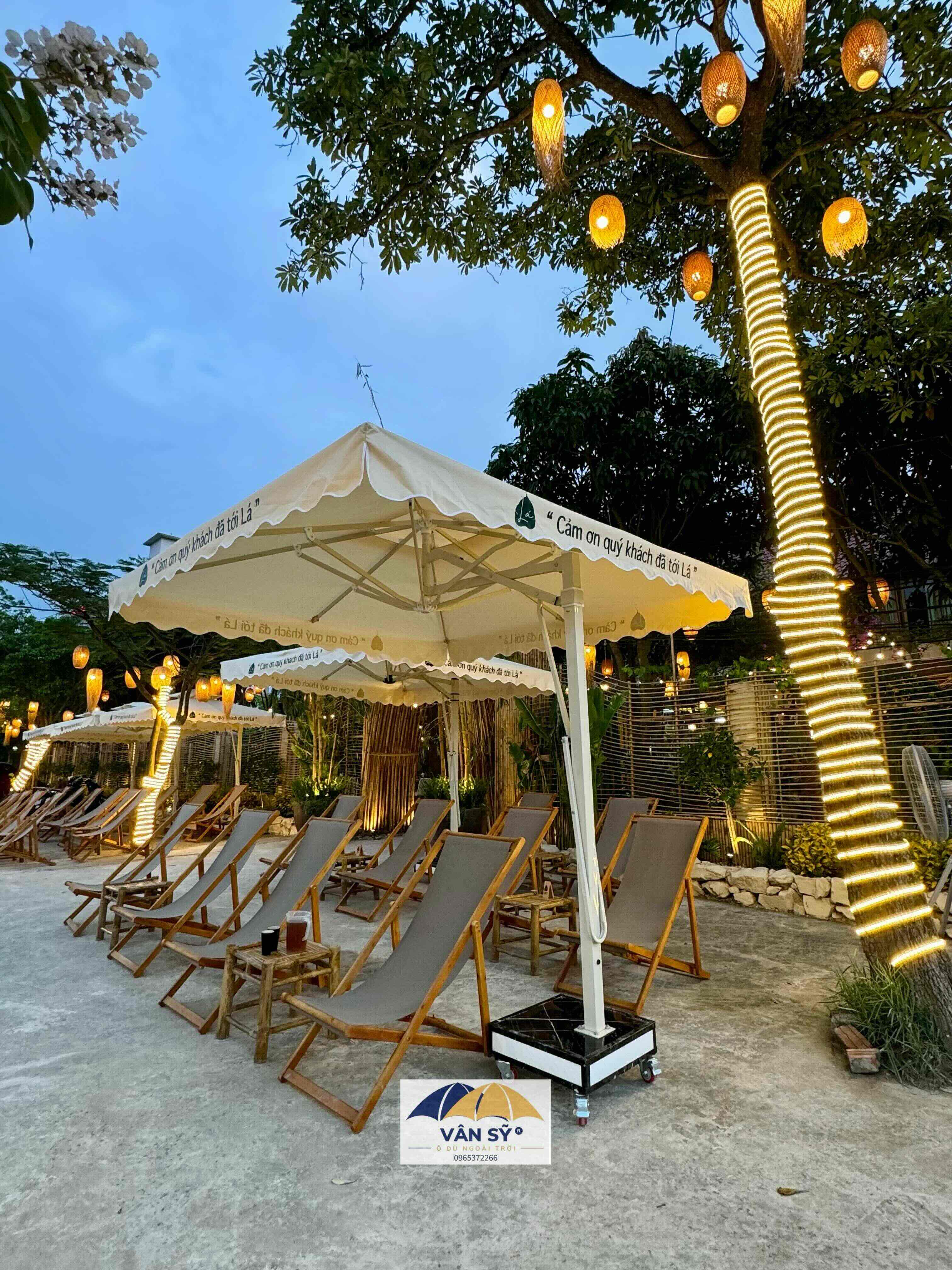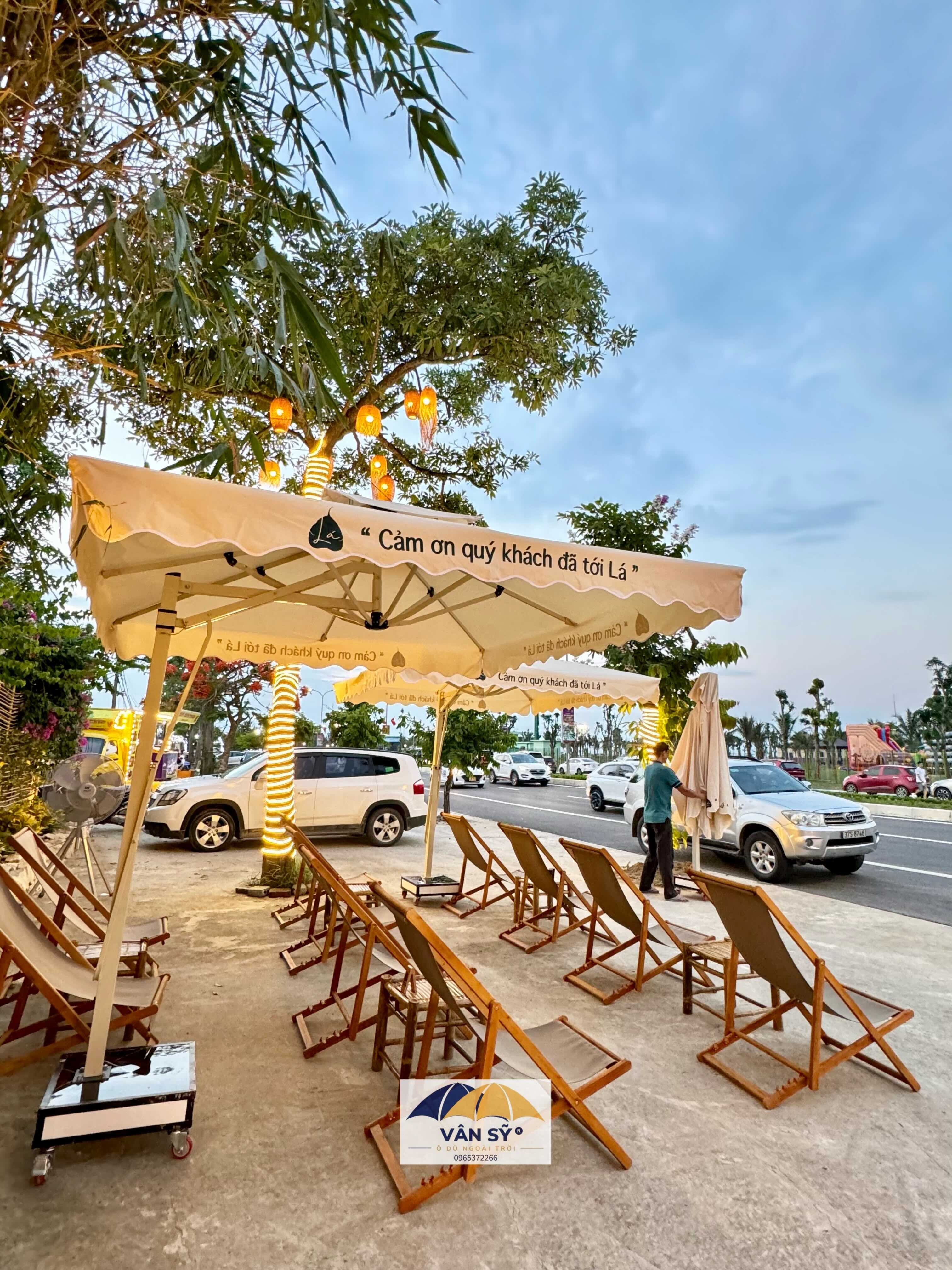 Cung cấp Ô Lệch tâm vuông 2,5m x 2,5m trang bị 8 thanh nan khung thép sơn tĩnh điện toàn phần chịu lực chịu gió che nắng cho Tổ Hợp "LÁ" - Cafe, Ăn Sáng, Yoga studio, Homestay toạ lạc tại đường Bình Minh Cửa Hội - Thành phố Vinh - Nghệ An (gần đối diện VinWonder Cửa Hội)